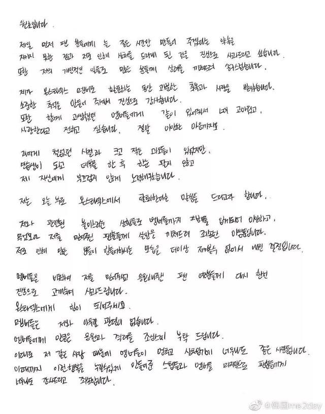 首先,对于没能遵守一直只给粉丝创造美好时光的,以及因我而遭受的伤害,真心地道歉。因为我个人的事让很多人担心,感到歉疚不安。