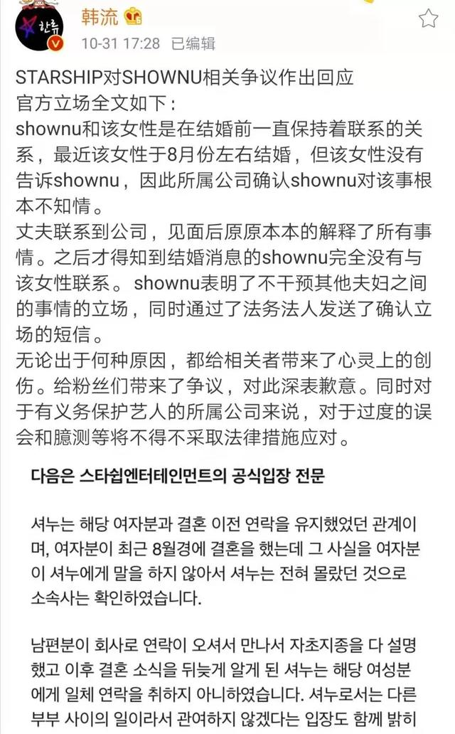而对于这个争议,星船表示,不是这样的,是那个女生自己结婚了不告诉shownu,他是受害者。