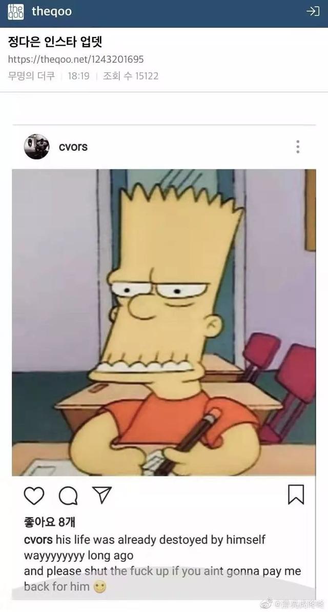 而这句话,似乎刺激到了郑多恩,29日,她突然发了INS,发布了Monsta X成员元虎的照片并说道:“浩锡(元浩本名),我的钱什么时候还?”。
