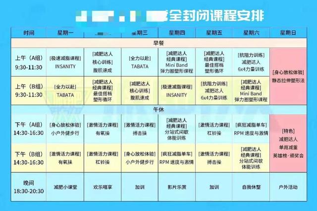 这看似十分充实的安排,是小艺(化名)在封闭式减肥训练营的每日必修课,每天早上从8点起床到晚上9点,除了午休和吃饭,其余时间小艺基本都在运动训练,大约7小时。
