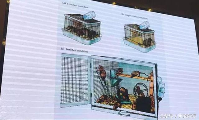 在加州的时候,洪兰曾亲身参与了一个实验:把1只老鼠关在笼子B,同时笼子里有很多玩具,2只老鼠关在笼子A,10只老鼠关在笼子C。实验结果显示,有很多玩具却没有玩伴的那只老鼠大脑神经里的连接很稀少,有同伴的老鼠却很多;而且笼子A中的2只老鼠和笼子C中的10只老鼠的脑部神经并没有任何区别。