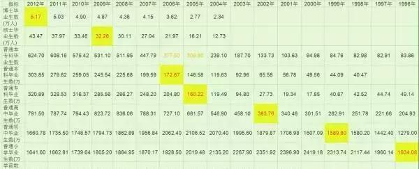 专科生和本科生,都是可以考硕士的,但专科是毕业后两年才可以考,因此这个数据要往前挪两年。考虑到研究生可能是连续多年有人考,数据不一定准确,但也能说明问题。粗略统计,所有生中,只有12%的人考研成功。而研究生中,有16%的人考上博士并继续深造,还不一定是同一年毕业,好在博士生毕业数量在09年后每年变化都不大(约为5万)。总的来说,研究生占同龄人的1.61%,博士生占到的0.26%。