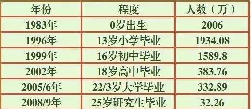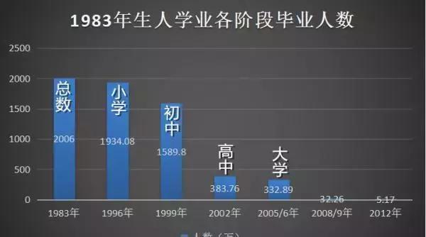 我们选取1983年出生的孩子为例,看他们这一届的孩子过关斩将,到最后升上,是一种怎样的体验吧。1983年出生了2006万个新生儿,考虑不一定就是1983年出生,查看出生数据,前后几年,均是这个数据大差不离。而这些孩子,到1996年的时候,就会从小学毕业。1999年初中毕业,2002年高中毕业,2006年毕业(专科生于2005年毕业),2009年硕士毕业,2012年博士毕业。