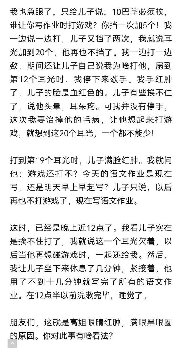 前段时间刷到一条微头条,可以说是一位妈妈的自白,这位妈妈因为孩子写作业不认真而连续扇了孩子19个巴掌,通篇看完后,同为母亲,我对这位女士的心理想法感同身受,但是更觉得她掌掴孩子的行为可恨又可悲,而孩子也同样令人又气又疼。