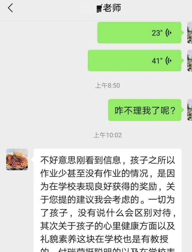这时,我也才注意到,班主任给我的回复:不好意思,刚看到信息,孩子之所以作业少,甚至没有作业的情况,是因为在学校表现良好,获得的奖励,关于您提的建议,我会考虑的,一切,为了孩子,没有说什么,会区别对待;其次,关于孩子的心里健康方面,以及礼貌素养,这块,在学校也是有教授的,你家孩子挺聪明的,以及在学校表现的都很棒,您也别太担心。