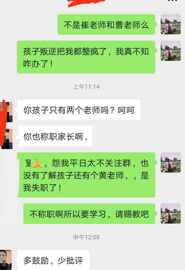 又等了一中午,不见回话,我怀疑是班主任,以为我在找她麻烦,让这个音乐老师批评我的。于是,我给班主任直接语音,问她:黄老师的情况,她说:咋了?我不在接。她的话,说,只一股脑把我和孩子的事告诉她,希望她给孩子点心里开导。