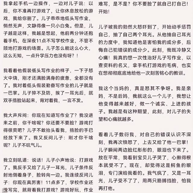 前段时间刷到一条微头条,可以说是一位妈妈的自白,这位妈妈因为孩子写作业不认真而连续扇了孩子19个巴掌,通篇看完后,同为母亲,我对这位女士的心理想法感同身受,但是更觉得她掌掴孩子的行为可恨又可悲,而孩子也同样令人又气又疼。话不多述,先上图。说...